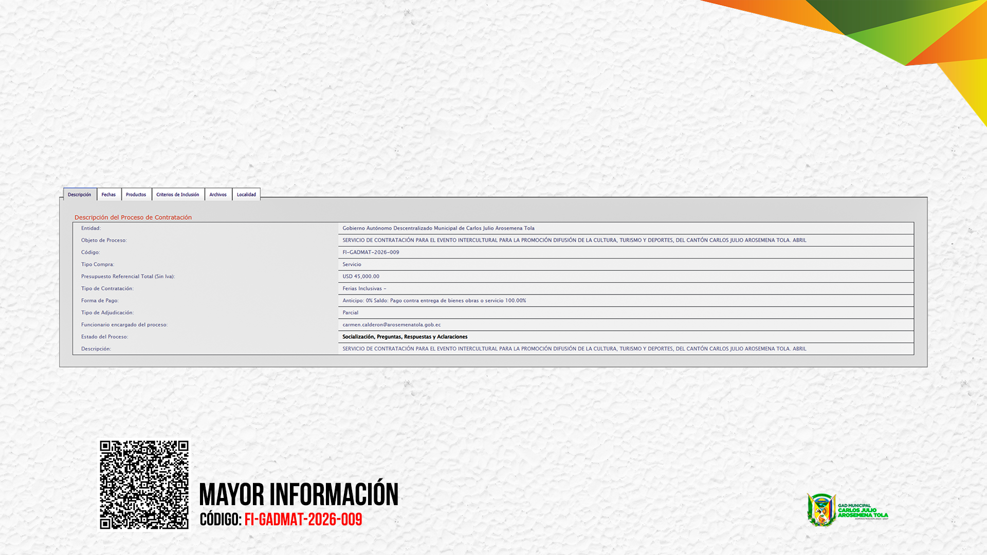 El GOBIERNO AUTONOMO DESCENTRALIZADO MUNICIPAL DE CARLOS JULIO AROSEMENA TOLA convoca a través del Portal Institucional del Servicio Nacional de Contratación Pública, y página web del Municipio de CARLOS JULIO AROSEMENA TOLA, a todas las personas naturales o jurídicas, ya sea de manera individual o a través de asociaciones o consorcios o por compromiso de asociación o consorcios, que estén domiciliadas en el Cantón Carlos Julio Arosemena Tola, para la presentación de ofertas relacionadas con el: “SERVICIO DE CONTRATACIÓN PARA EL EVENTO INTERCULTURAL PARA LA PROMOCIÓN DIFUSIÓN DE LA CULTURA, TURISMO Y DEPORTES, DEL CANTÓN CARLOS JULIO AROSEMENA TOLA. (ABRIL)”; que estén habilitadas en el Registro Único de Proveedores- RUP, siempre y cuando cumplan una de las siguientes condiciones: